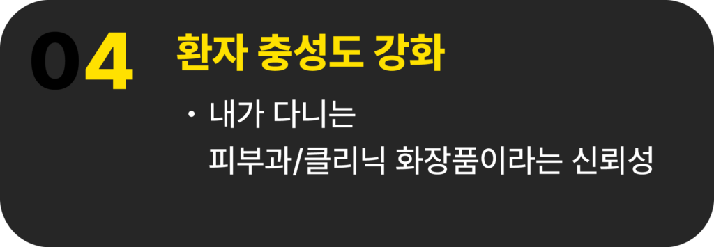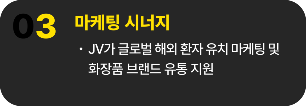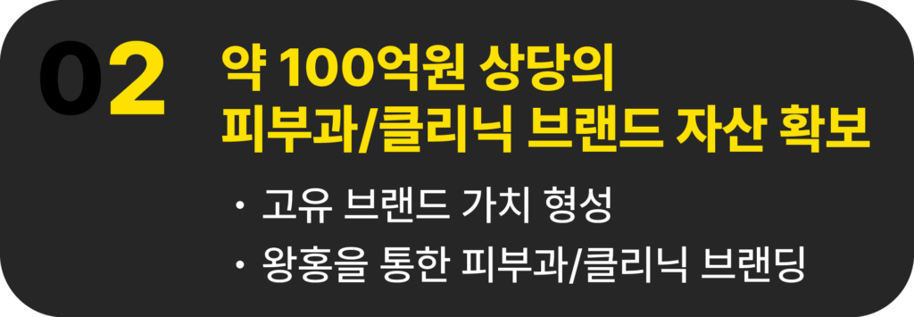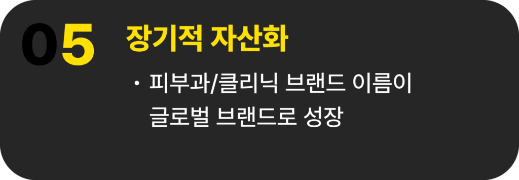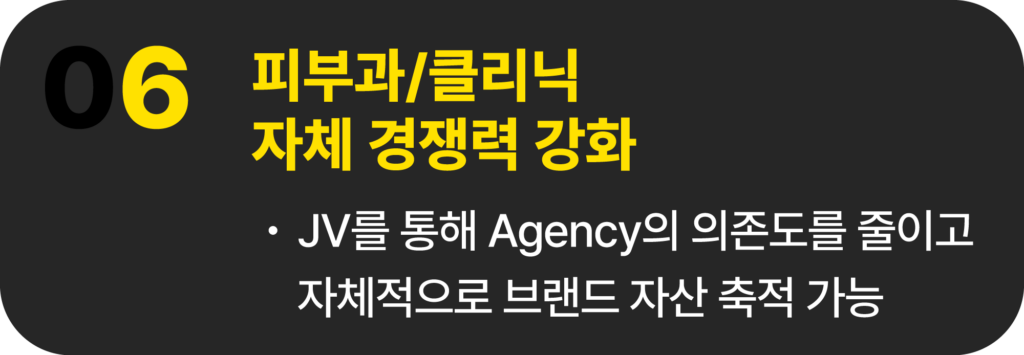 HOW WE WORK 가치를 만드는 실행 구조 Value 코더마랩과의 협업은 진료 중심의 단일 수익 구조를 제품 판매와 브랜드 라이선싱까지 확장합니다. 의료진의 전문성이 시장에서 인정받는 브랜드 IP로 성장하며, 해외 환자 유치와 글로벌 유통을 통해 지속 가능한 다각화 수익을 창출합니다. Collaboration Model Value for Clinics 코더마랩의 설계는 피부과/클리닉 고유의 브랜드 자산으로 축적합니다. 이는 단기 수익이 아닌, 피부과가 소유하는 100억 규모의 브랜드 가치입니다. Workflow Integrated Derma-System 피부과/클리닉의 전문성과 신뢰성에 대한 정확한 이해와 해석을 바탕으로 제품을 생산해 차별화된 기술력 및 품질 경쟁력 확보 Superiority 브랜드 기획 ▼ 제품 개발 R&D ▼ Clinical Insight & Technological Excellence 피부과/클리닉의 전문성과 신뢰성에 대한 정확한 이해와 해석을 바탕으로 제품을 생산해 차별화된 기술력 및 품질 경쟁력 확보 Flexibility 제품 디자인 ▼ 제품 생산 ▼ Flexible Production & Responsive Market Strategy 제품 디자인부터 생산까지 모듈형 • 유연 구조로 설계해 사양 변경 • 라인 확장 • 소량 다품종 생산에 신속 대응 Profitability 마케팅 ▼ 유통 Operational Efficiency & Sustainable Profitability 마케팅 • 유통 • 생산 전 과정을 통합 관리하여 지속 가능한 고수익 구조 확보